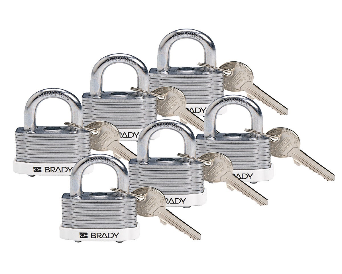 De stalen Brady-hangsloten zijn vervaardigd in versterkt gelamineerd staal zodat ze bestand zijn tegen extreem fysiek geweld, en zijn voorzien van een beugel in gehard staal die hen moeilijk door te knippen maakt. De lagen van de behuizing zijn afzonderlijk gecoat voor een superieure roestvastheid. De cilinder met 5 stiften biedt meer unieke sleutelvarianten en is beter beveiligd tegen manipulatie dan conventionele sloten met 4 stiften. Gekleurde stootbandjes beschikbaar voor identificatie en bescherming, en gepersonaliseerde labeling is verkrijgbaar. Hangsloten zijn Keyed Different verkrijgbaar. Sleutelblokkering (sleutel kan niet uit het slot worden verwijderd voor het hangslot goed gesloten is) Andere sleutelsystemen en registratie zijn mogelijk. Vergrendelingslabels worden afzonderlijk verkocht.