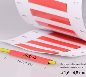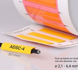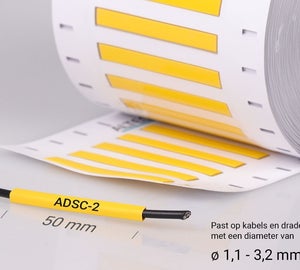 ADSC Sleeves | 50x9 mm | Geel | 750 per rolDe juiste afmeting van jouw label is afhankelijk van de diameter van de kabel of draad die je wil identificeren. Is jouw kabel of draad tussen de 0,8 en 2,4 mm? Dan is de hoogte van jou label 5 mm. De breedte van het label is afhankelijk van hoeveel labels je per rij wil.