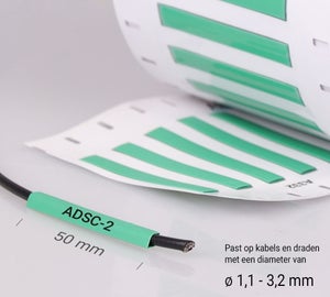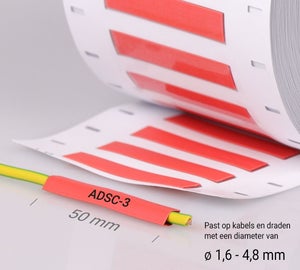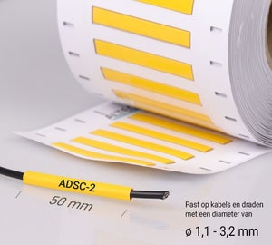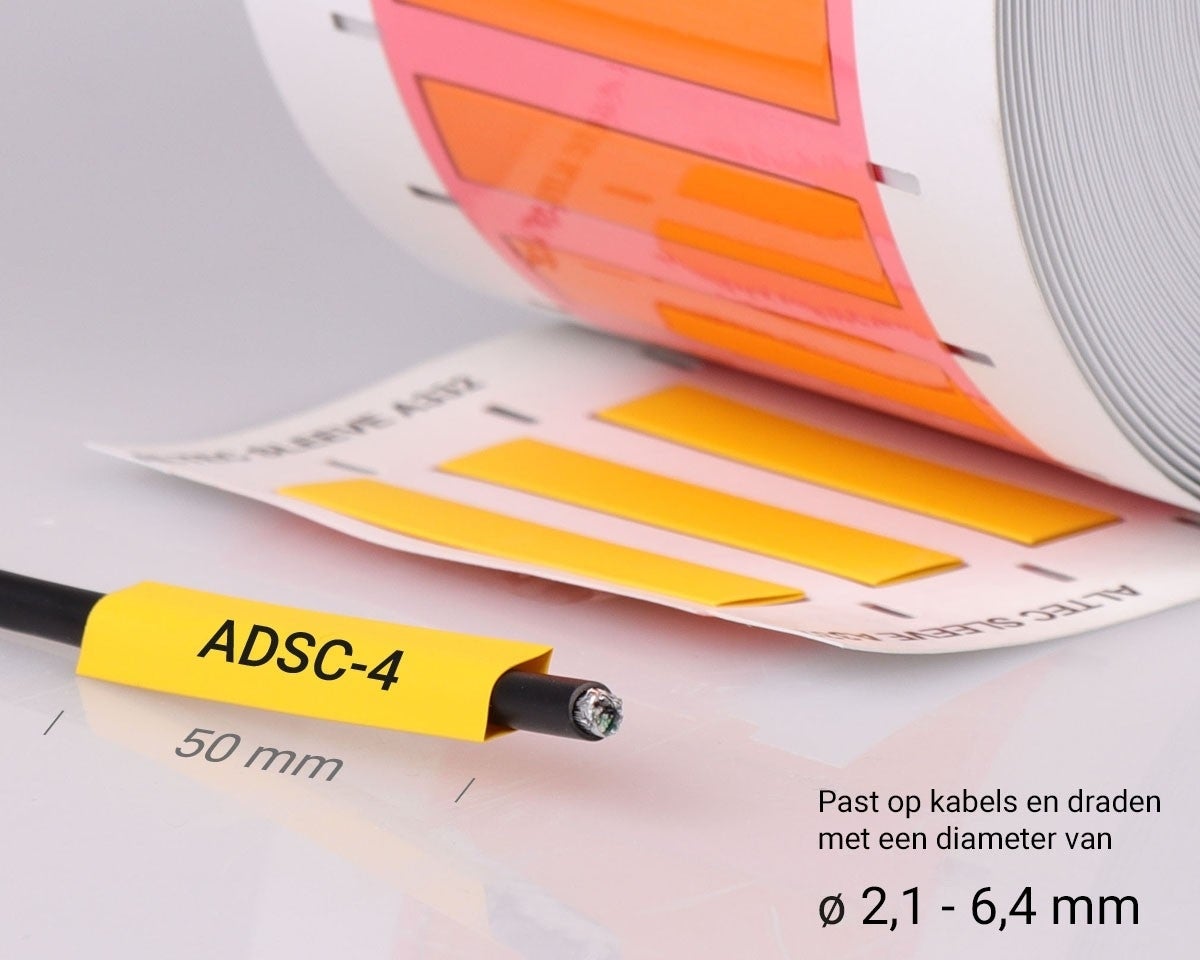 ADSC Sleeves | 50x9 mm | Geel | 750 per rolDe juiste afmeting van jouw label is afhankelijk van de diameter van de kabel of draad die je wil identificeren. Is jouw kabel of draad tussen de 0,8 en 2,4 mm? Dan is de hoogte van jou label 5 mm. De breedte van het label is afhankelijk van hoeveel labels je per rij wil.