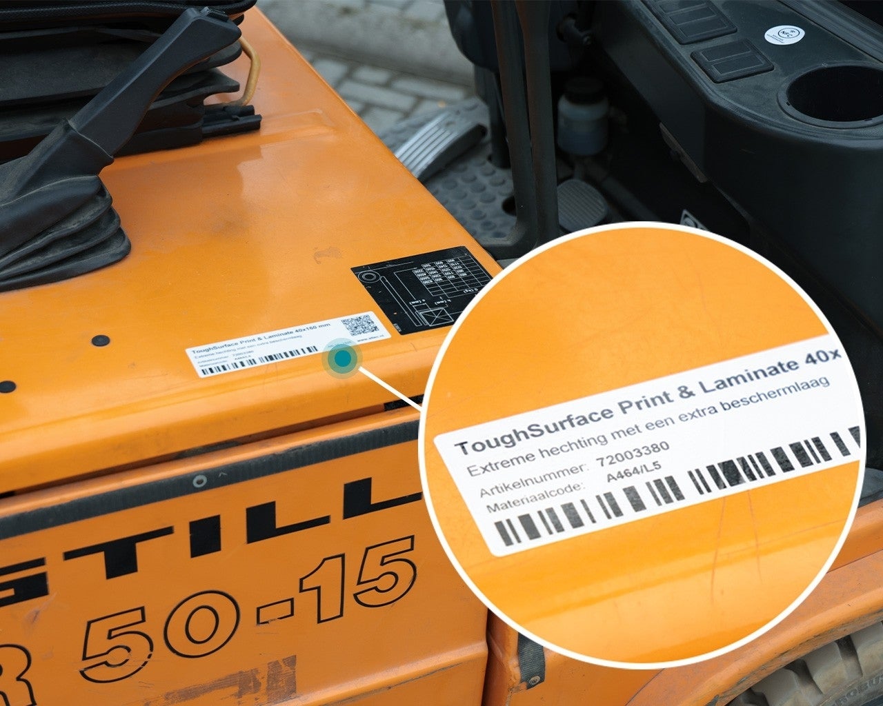 Onze ToughSurface Print & Laminate labels bieden niet alleen de extreme kleefkracht van ToughSurface labels, maar zijn ook voorzien van een vast beschermlaminaat. Dit maakt het label perfect voor zware industriële omgevingen. Dankzij de handige vouwconstructie breng je eenvoudig de extra beschermlaag aan, waardoor de levensduur van het label met nog meer jaren toeneemt.