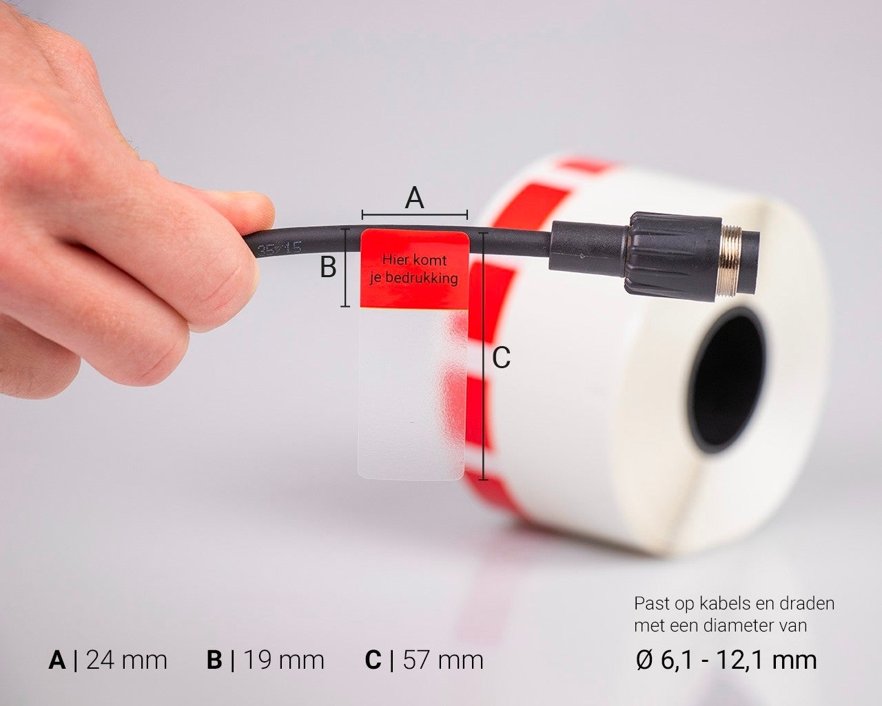Naast gekleurde labels hebben we ook standaard witte wikkellabels. Daarnaast bieden we TwistLabels aan, die een extra voordeel bieden: je kunt ze na het aanbrengen eenvoudig verplaatsen en draaien voor optimale zichtbaarheid. Dit maakt het eenvoudiger om het label in de ideale positie te plaatsen, zodat je codering vanuit elke hoek duidelijk zichtbaar blijft. Wil je verschillende kleuren kunnen bedrukken op je wikkellabel? Bekijk dan onze Full-color wikkellabels.