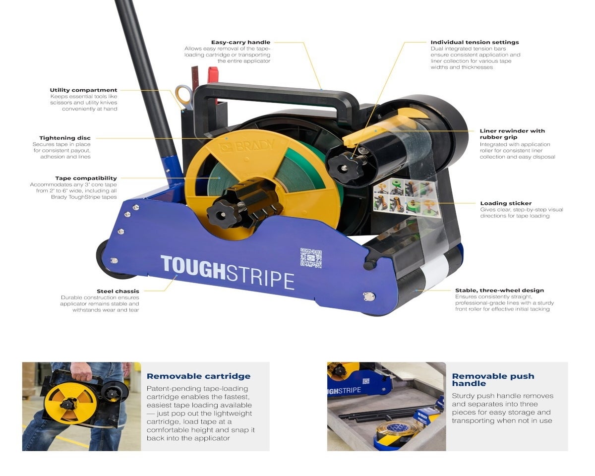 Breng comfortabel rechtere lijnen aan in minder tijd met de ToughStripe® vloertape-applicator. Vermijd stress en inspanning dankzij de verwijderbare cartridge en andere gebruiksvriendelijke functies.