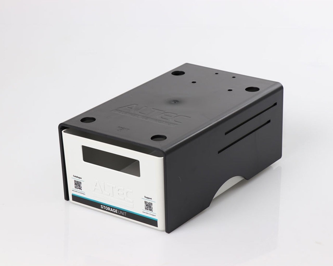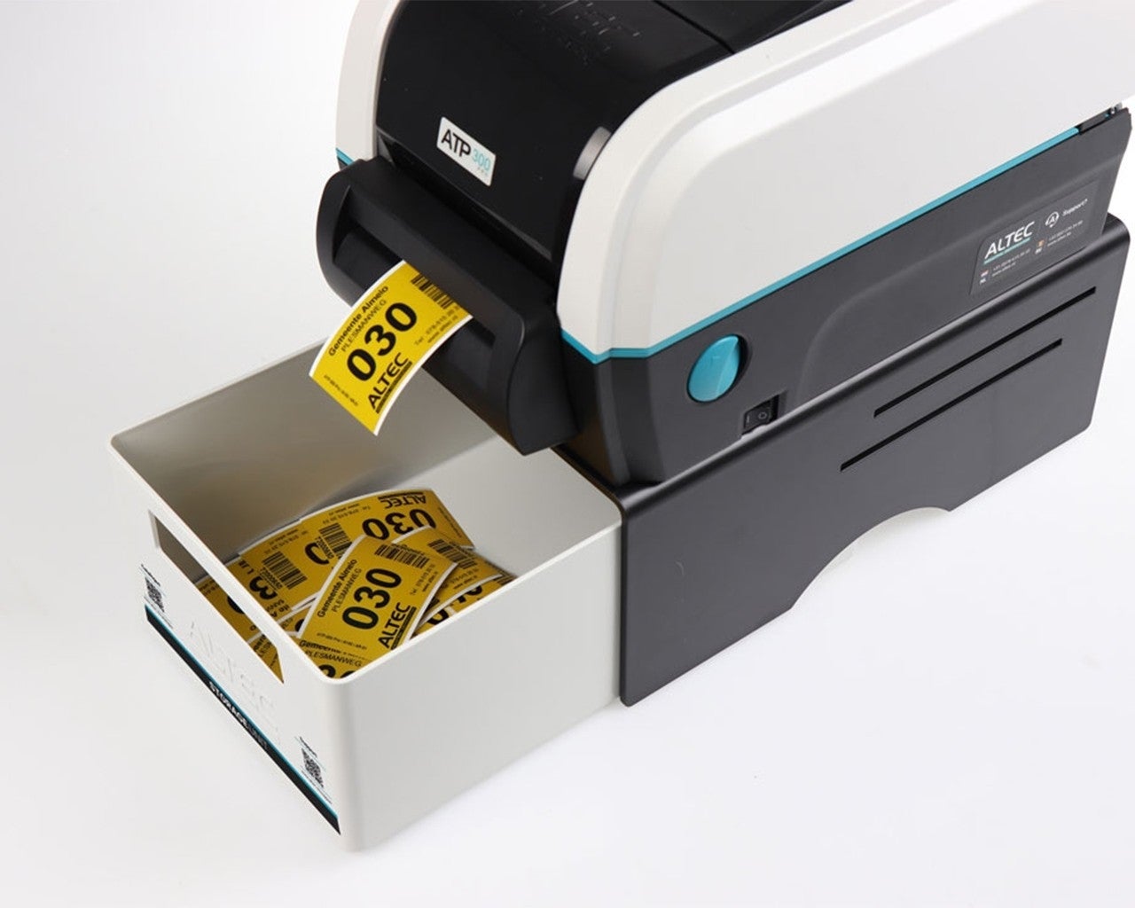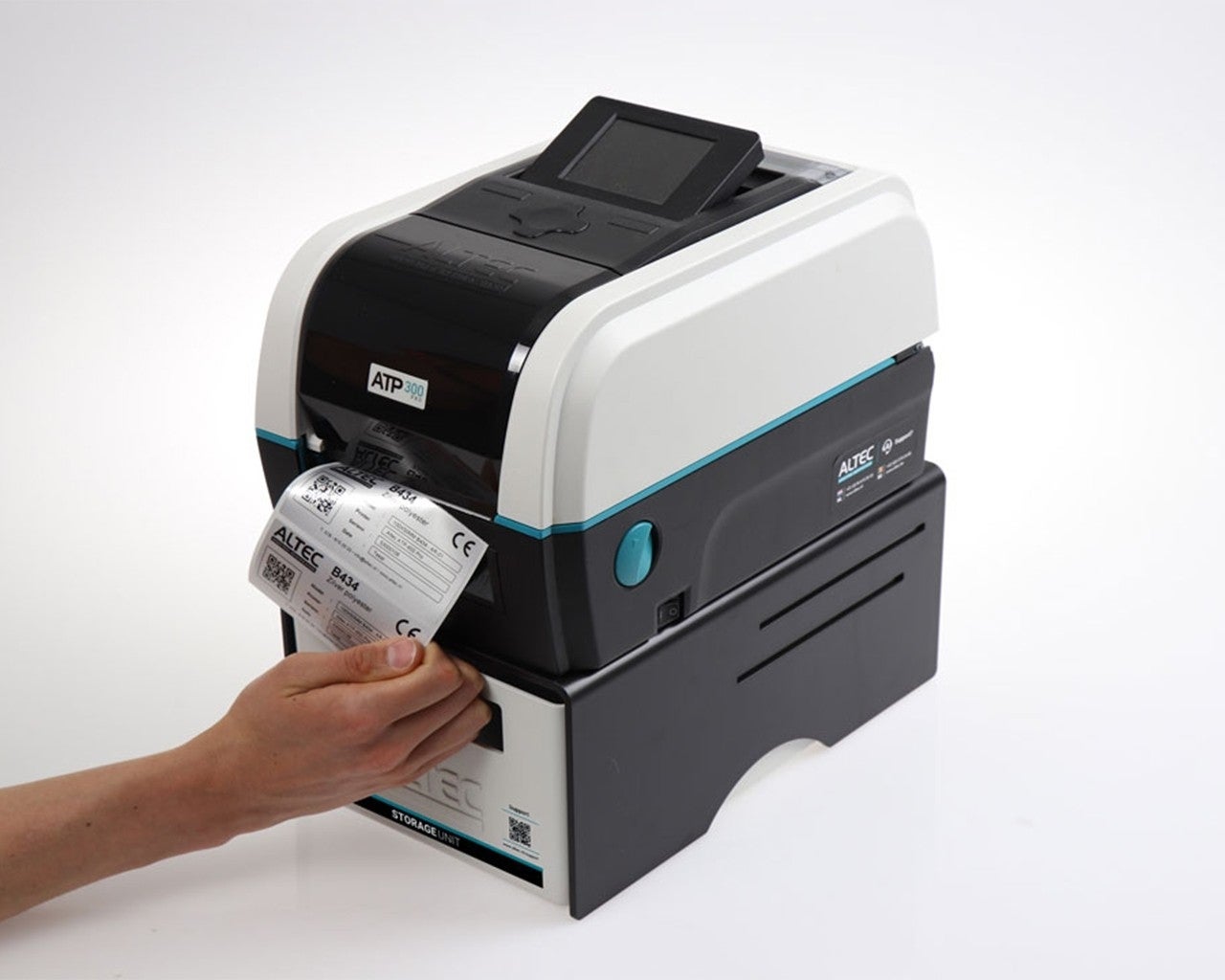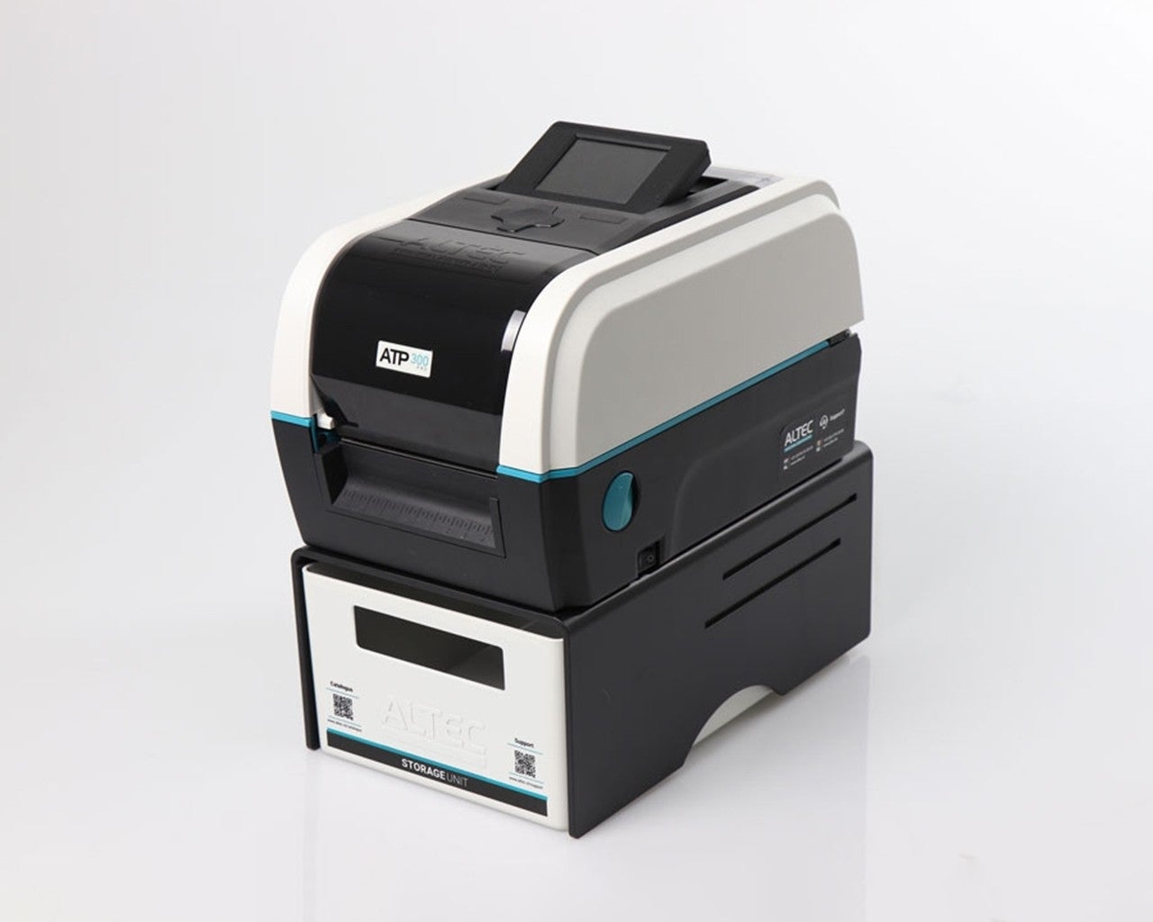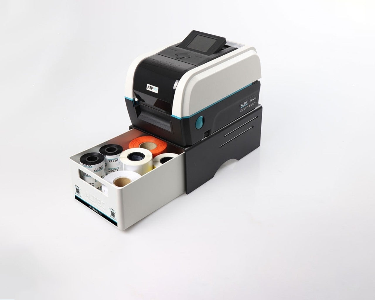 De ATP Storage Unit bestaat uit een zwart U-vorm platform met een witte lade. Te gebruiken voor opslag van labelmaterialen of als opvangbak voor afgeknipte labels. Ook het afscheuren van labels is eenvoudiger doordat de printer hoger staat.