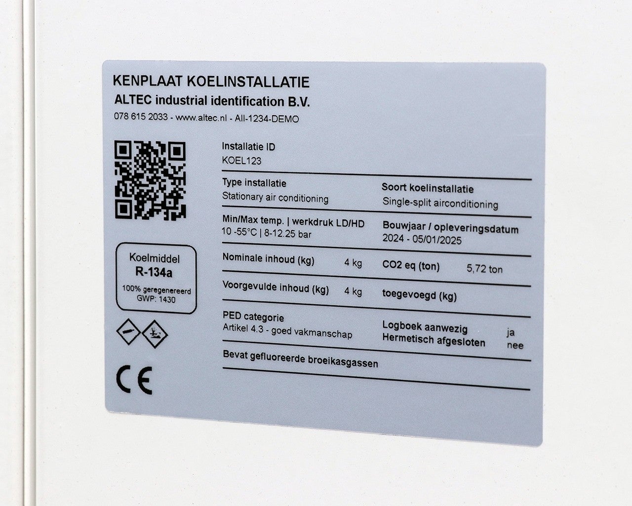 Met Climapulse en deze printerset genereer en print je eenvoudig kenplaten rechtstreeks vanuit je koudemiddeladministratie. Hiermee voldoe je aan de wettelijke voorschriften, zoals de BRL-100 norm en de Europese Richtlijn voor drukapparatuur (PED), die vereisen dat koelinstallaties van kenplaten zijn voorzien.