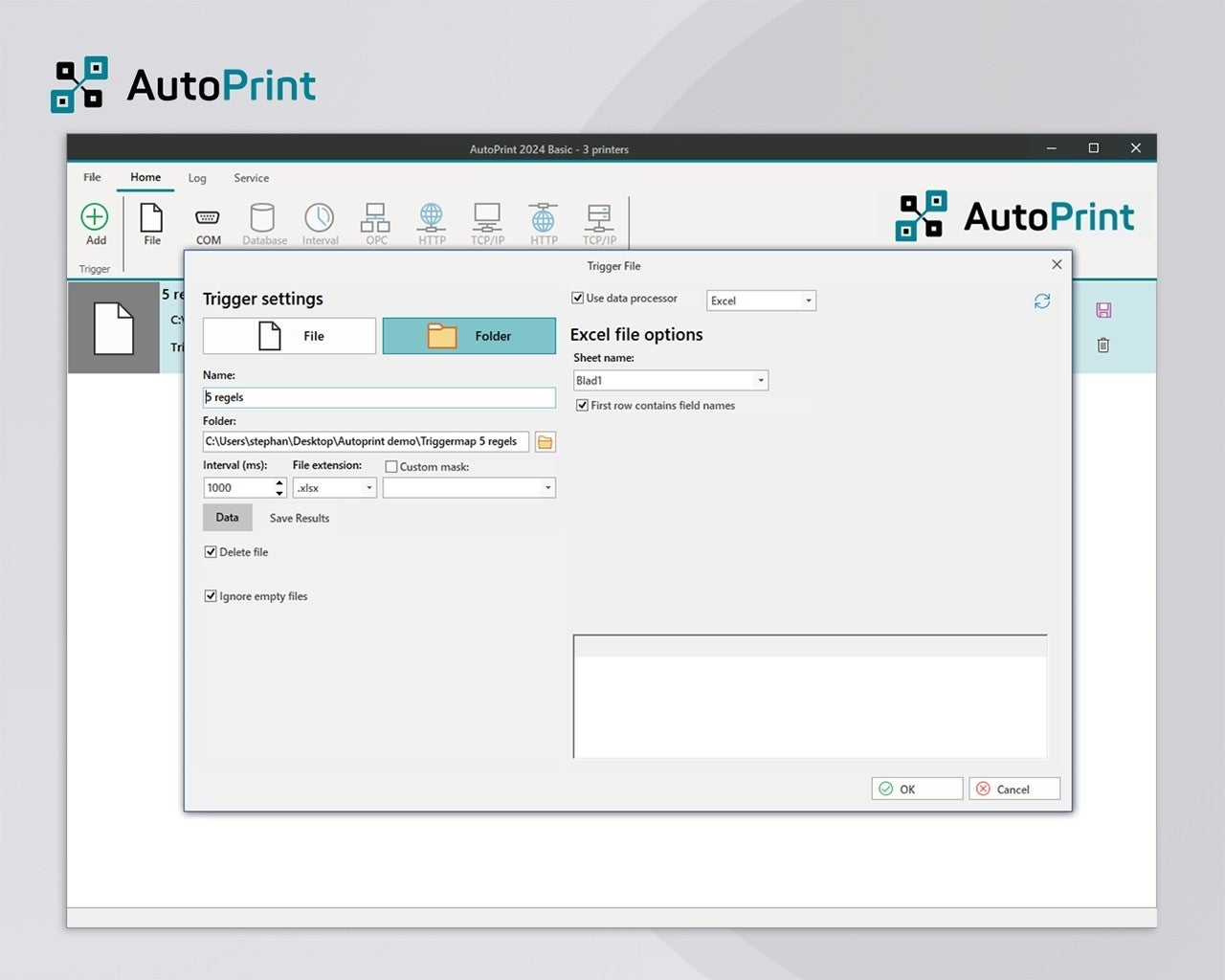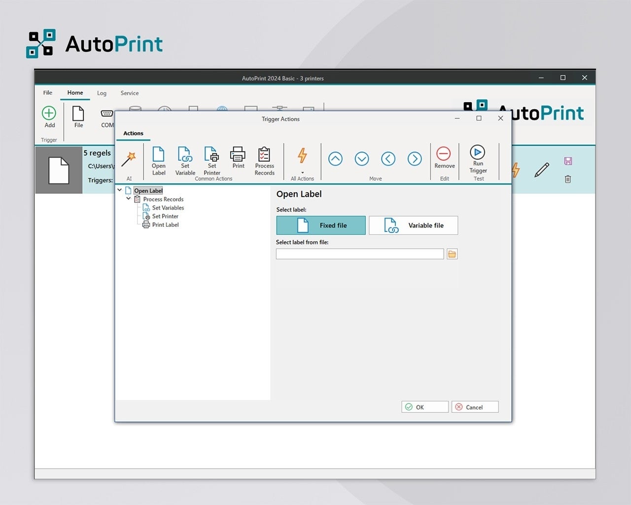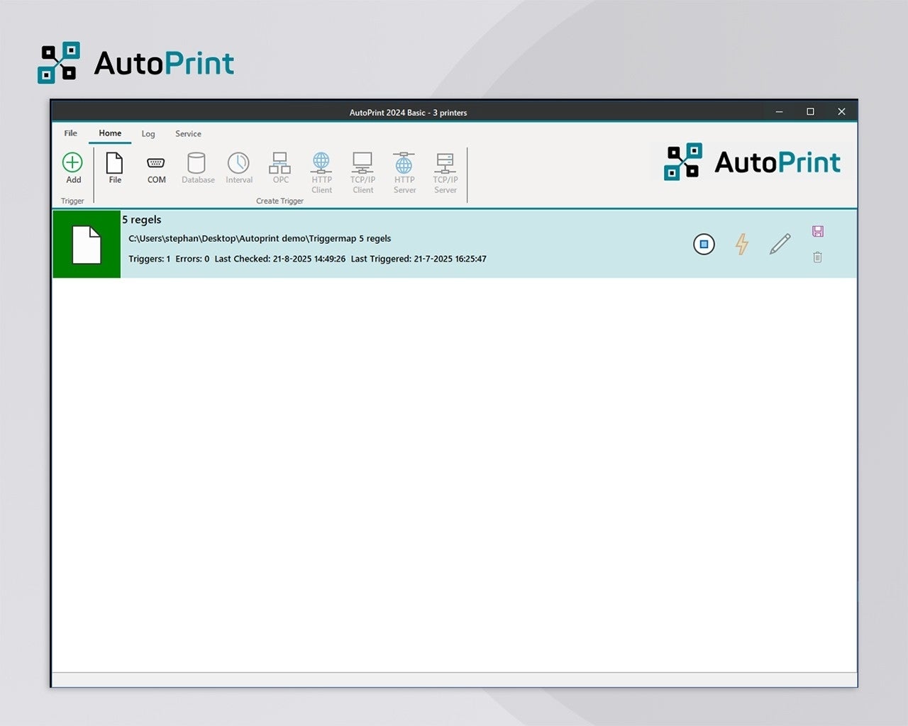 AutoPrint kan worden getriggerd door een bestand of folder-event. Zodra er een Excel- of CSV-bestand beschikbaar komt, start automatisch een printopdracht met de bijbehorende data. Een QlickPrint licentie is vereist voor het ontwerp en beheer van de label lay-outs. Autoprint wordt geleverd op basis van een jaarlijkse subscription met printer seats, zodat je flexibel kunt opschalen.